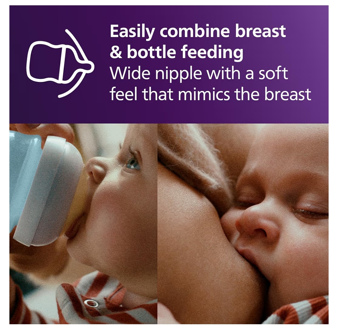 Combina fácilmente la lactancia materna y el biberón, con una tetina ancha en forma de seno con una sensación suave que imita la forma y la sensación de un seno; y el bebé controla el flujo de leche.